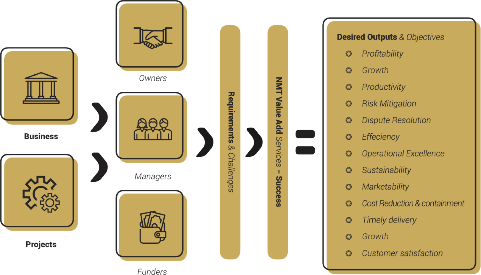 At NMT Consulting, our key clients are comprised of corporate and large businesses, SMMEs, Projects and Joint Ventures. With our clients we engage business or project owners, managers and/or funders as primary stakeholders and provide solutions to their requirements and challenges. Through the delivery of NMT’s Value Add Services we deliver successful solutions to meet the desired outputs and objectives of our valued clients.